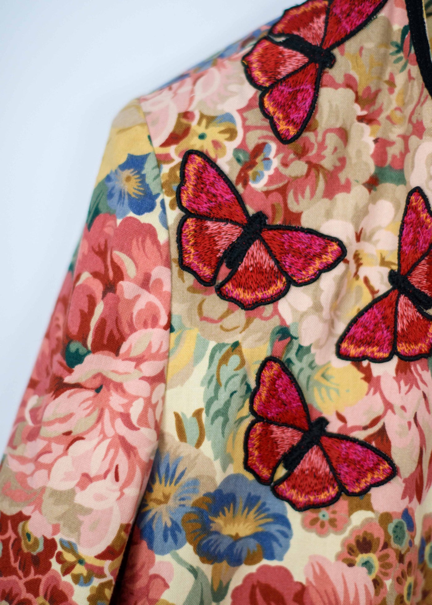 The intricate floral cotton fabric showcases rich, dimensional patterns that command attention while maintaining refined polish. Tailored for a structured silhouette, this piece transitions seamlessly from professional settings to upscale evening occasions. The luxurious textile and expert construction ensure lasting quality and timeless appeal.